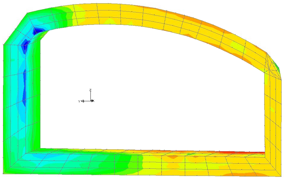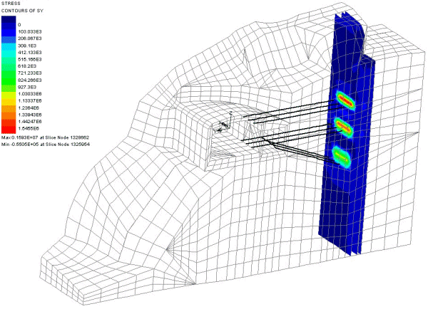 A longitudinal vertical section and a slice section inclined at 15 degrees towards Söderström (north) and 15 degrees to the east (to correspond with a fracture zone in the rock) enabled a detailed comparison to be made between the results from the LUSAS analysis and analytical results by others.