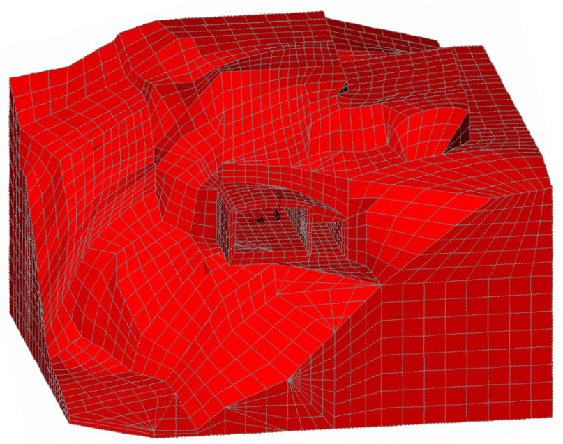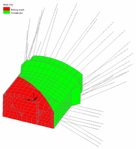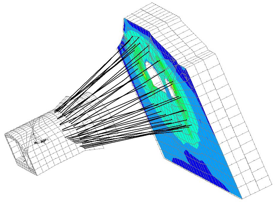 CAD model geometry representing a 70m long x 80m wide x 50m high volume of rock and tunnel was imported directly into LUSAS prior to defining the material properties, supports and various loading conditions that needed to be assessed. To verify the model built, the coefficient of friction at the contact surfaces between the concrete tunnel and the rock was set to zero and a single load case with just the anchorage cable tensions was applied. From this, initial stresses in the rock around the anchorage points, and stress transfer and stress levels in the concrete and the rock heel could be evaluated. Because of the interfaces used in the model a nonlinear analysis had to be undertaken.