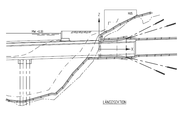 In the waters of Söderström the tunnel is supported at locations along its length by three pile groups and a caisson founded on bed rock. Concrete connectors at each end of the tunnel secure it to the rock mass with movements being accommodated at the Northern end. The reinforced concrete tunnel connector at the Southern end extends approximately 20m into the mountain tunnel and is shaped with a tapered heel. Rock anchors, extending a minimum of 20m backwards from the heel of the connector and a minimum of 10m transversely to the tunnel wall at one outer end of the connector, are used to tie the connector to the rock mass and restrain it against any imposed loadings. Between the attachment points the cables can move freely without transmitting forces to the rock.